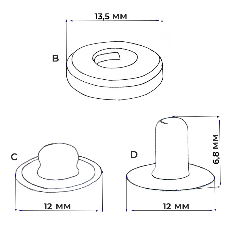 - Контакт DUS 6 является несколько усиленным по сравнению с универсальным # 486 (d -12 мм), благодаря более крупным деталям. Особенно подходит для изделий из плотных материалов.