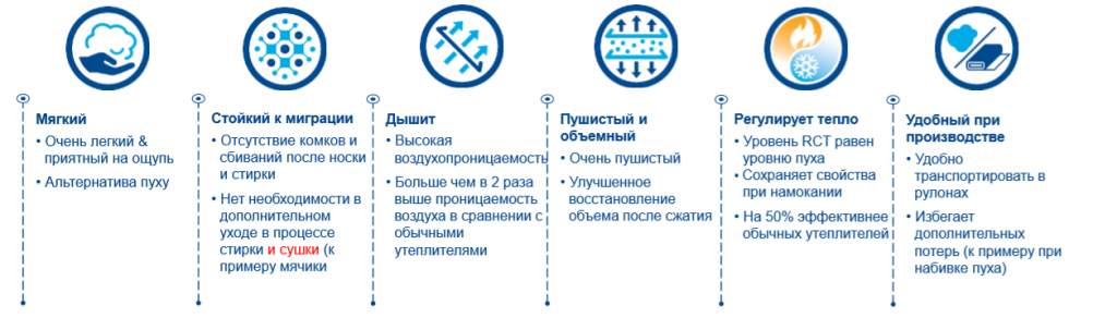 • Альтернатива пуху. В отличие от пуха сохраняет свои свойства при намокании и не вызывает аллергии.